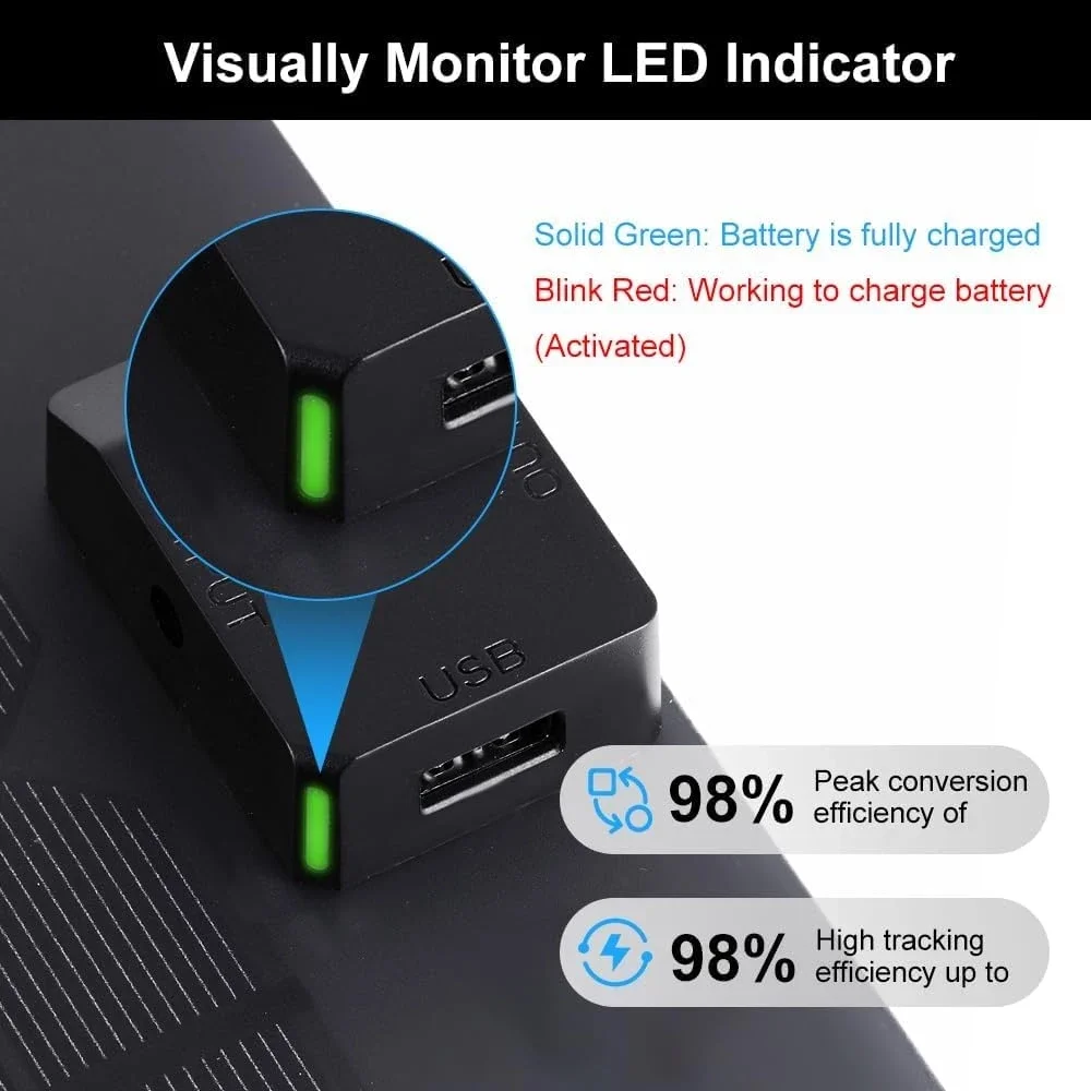 - 🚙【Upgraded Visual Monitor】:When the solar panel is charging, the output port displays a red light and a green light indicates it is fully charged. LED indicators help visually monitor the working status of solar panels and batteries. The battery will automatically stop charging after it is fully charged, and will automatically resume charging after it is discharged.